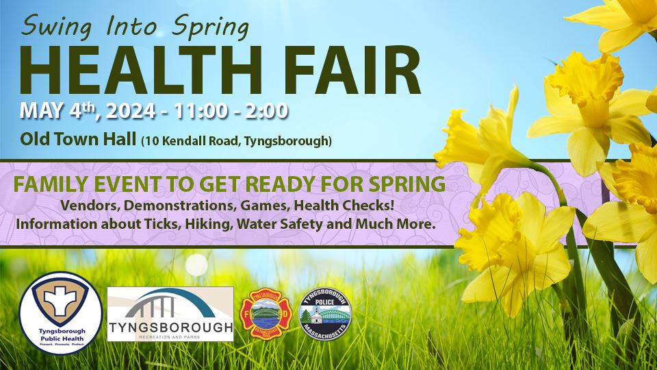 The Tyngsborough Board of Health, in partnership with the Recreation Department, Police Department, and Fire Department will host Swing into Spring Health Fair on Saturday, May 4th, 2024 from 11:00 AM to 2:00 PM at Old Town Hall (10 Kendall Road).