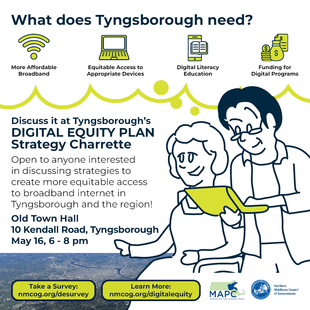 The Town of Tyngsborough is participating in the Greater Lowell Digital Equity Plan coordinated through the Northern Middlesex Council of Governments (NMCOG). This is a plan to improve residents' access to the internet, technological devices like smartphones and computers, and education about how to use digital tools. To inform the plan, we want to hear from you and those you know about their experiences. Brainstorm and prioritize strategies that will compete for state and federal grants!
