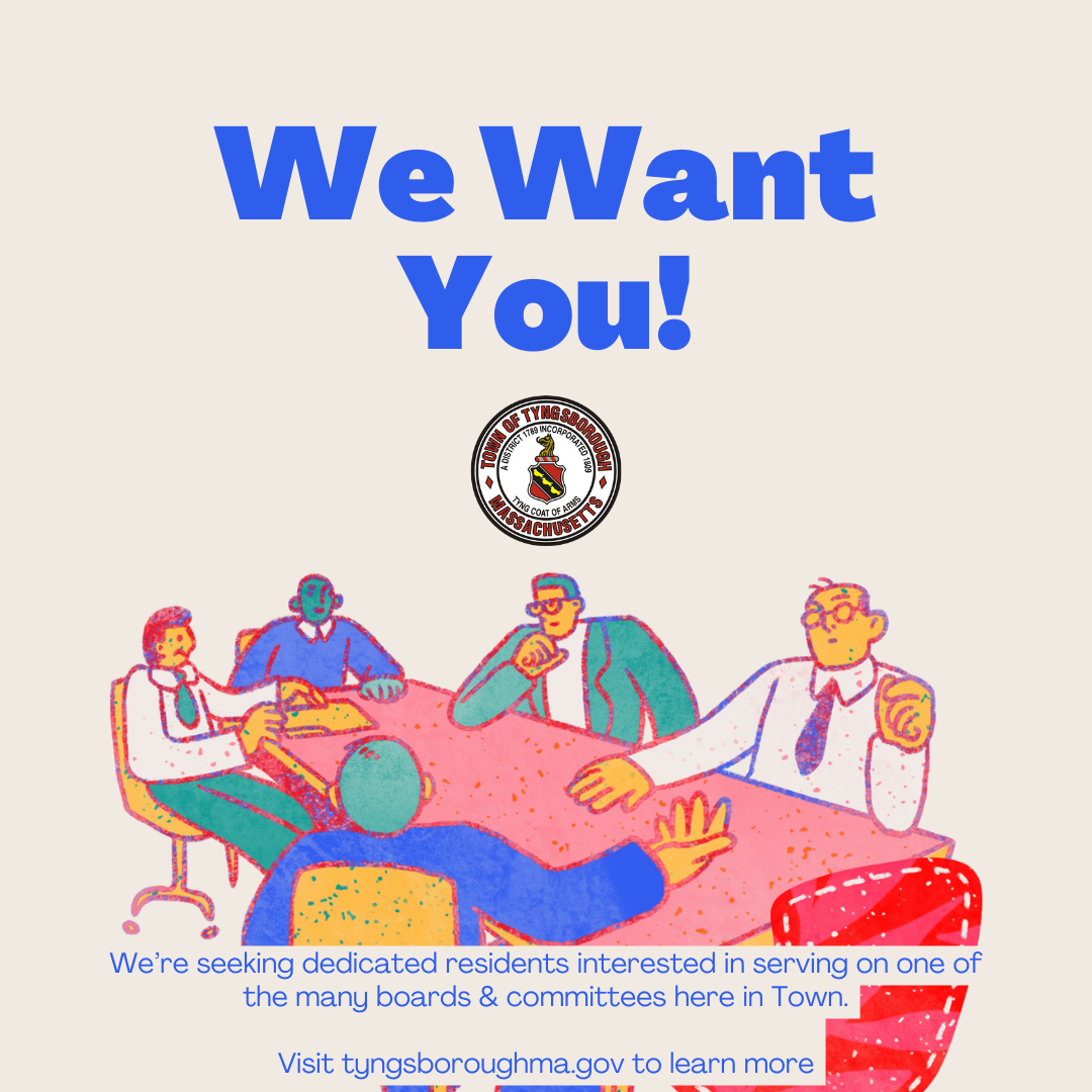 The Town of Tyngsborough is seeking motivated residents to serve on various Boards & Committees appointed by the Select Board with vacancies. In order to serve, interested candidates must be registered voters in the Town of Tyngsborough. You can find a full list of vacancies here.